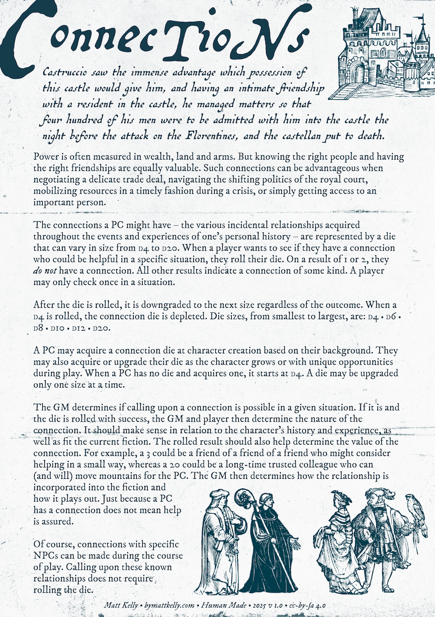 Connections is a simple tool for representing and calling on the various incidental relationships acquired throughout a player character's background in TTRPGs.