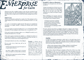 Characters may wish to establish a business or may come into ownership of some financial enterprise that will automatically generate profit for them on a regular basis. Here, then, is a simple system to include such money-making ventures in your Cairn game.